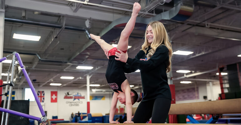 Gold Medal Gymnastics coach helping gymnasts flexibility.